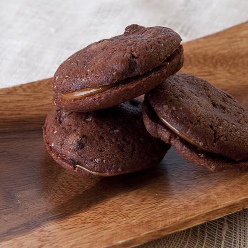 Две тонкие пластины из хрустящего шоколадного печенья с кусочками горького шоколада, соединенные между собой нашей фирменной тягучей карамелью...ммм!